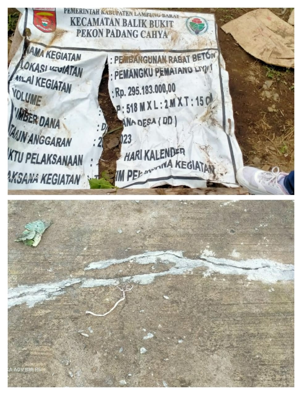 Jalan rabat beton yang di bangun dengan menggunakan dana desa tahun 2023 yang menelan biaya Rp 295.183.000.000 dengan volume panjang 518 meter, lebar 2 meter dan ketebalan 15 cm, diduga tidak sesuai dengan spesifikasinya.